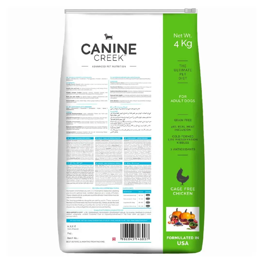 Canin Creek Adult Grain Free contains 48 % Real chicken and 10% cold kibble. It also includes fresh free run farm chicken, vegetables and fresh laid nest eggs. Zero soya, corn, wheat, rice ensure it is grain and Gluten free, while containing 7 super anti-oxidants- apples, blackberries, cranberries, pomegranate, pumpkin, spinach & blueberries.