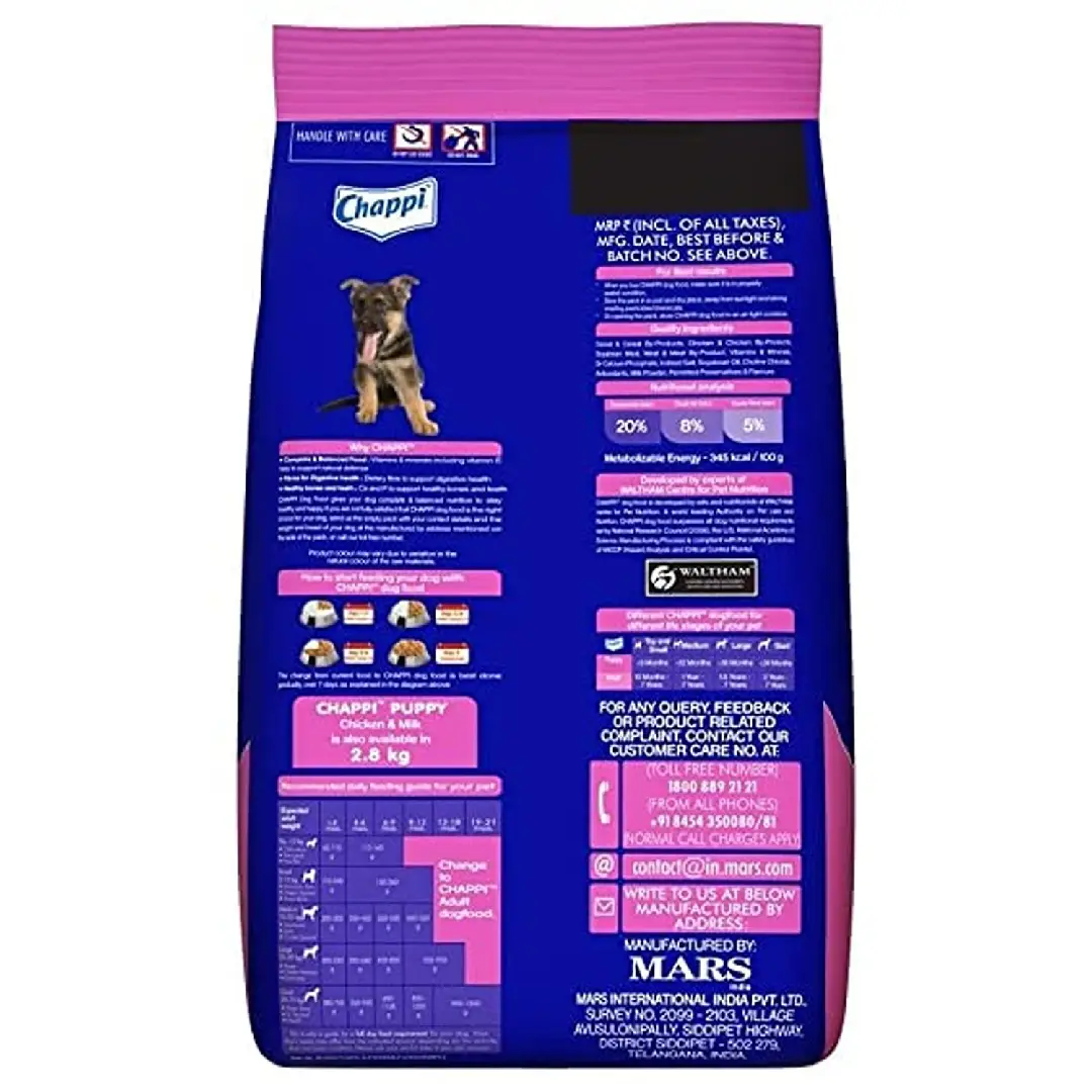 Chappi Puppy Dry Dog Food – Chicken & Milk is highly digestible dry dog food. It is highly nutritious and dogs love it’s taste. Your little furball will especially love this food for puppies which is tasty as well as nourishing, giving them 100% satisfaction. Chappi dog food is delicious with chicken and milk flavor and does not contain any artificial colorants to give your friend hearty wholesomeness. It is formulated to meet or surpass the nutritional levels that are necessary for the healthy development and growth for all dog breeds. It is a tailor-made formulation of dog food which embraces the daily needs of small dogs.