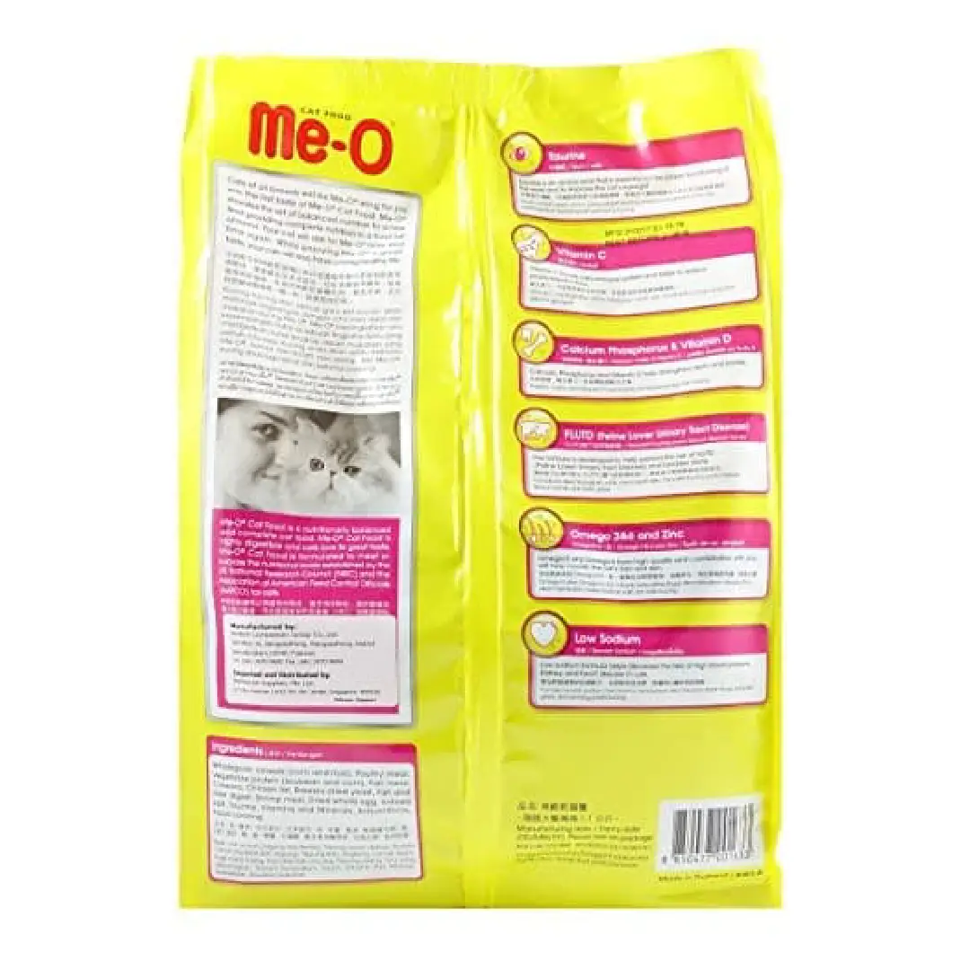 Me-O Gourmet Cat Food offers complete, balanced nutrition with high palatability. Enriched with taurine for eye health, vitamin C for immunity, and omega fatty acids for skin and coat health. It also helps prevent FLUTD and supports strong bones and teeth.