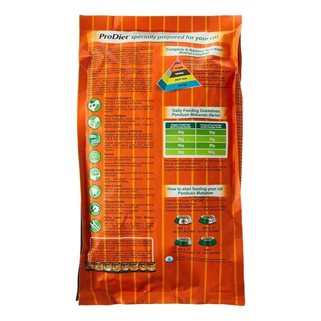 ProDiet Tuna Dry Cat Food is made with premium ingredients to provide a nutritious diet that supports your cat’s overall health. Enriched with vitamins, minerals, and essential nutrients, it promotes a strong immune system and digestive health with the help of prebiotics and probiotics. The blend of organic minerals helps control urinary pH, while all ingredients are thoroughly tested for safety, quality, and nutritional value.