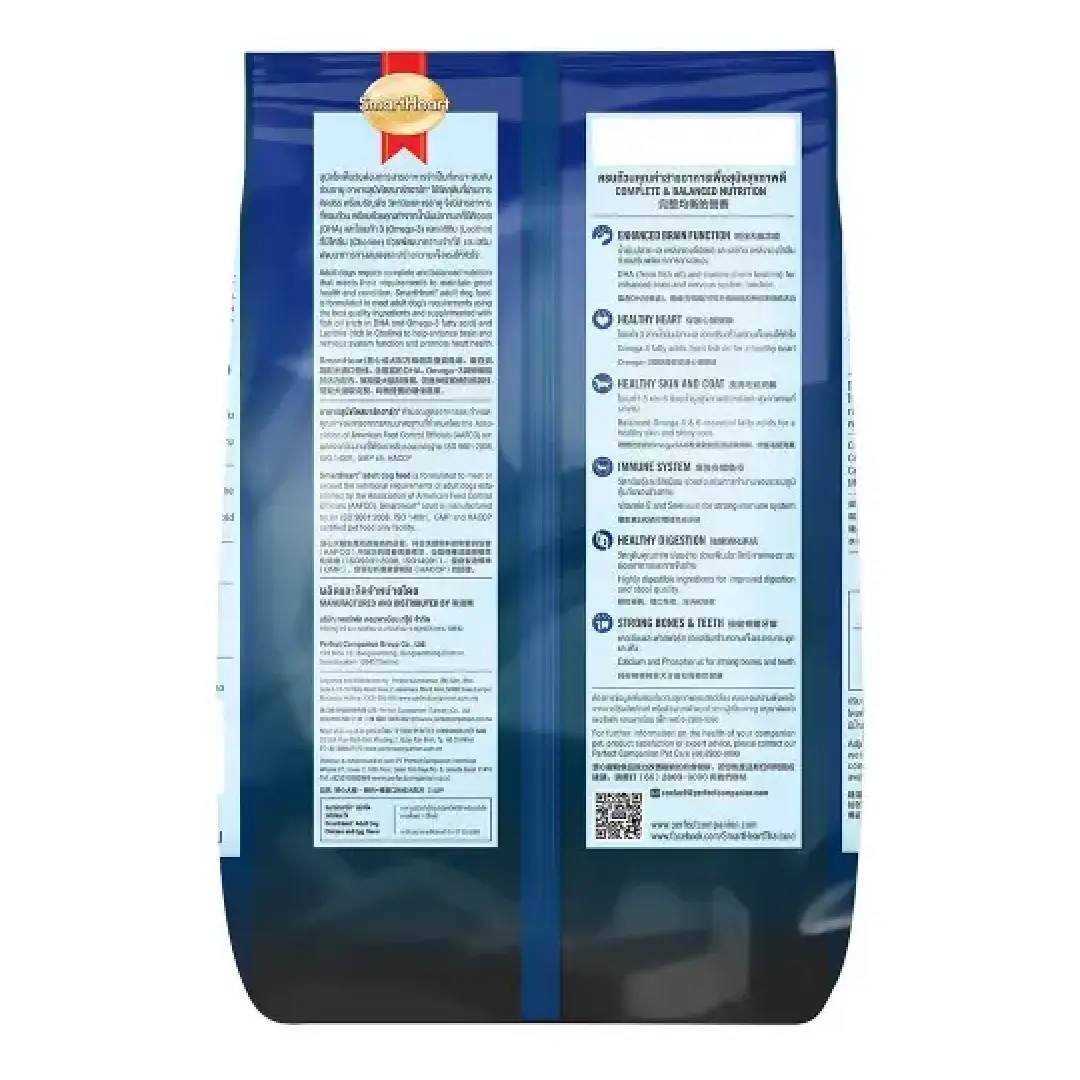 SmartHeart Adult Dog Food is specially formulated to meet the nutritional needs of dogs over one year of age. As dogs mature, their dietary requirements change, and this food provides the essential nutrients to support healthy aging. The high-quality meat proteins, grains, vitamins, and minerals ensure that your dog gets the necessary nutrition for optimal health. Enriched with animal oil containing omega-3 fatty acids (DHA) and emulsifiers, this food helps enhance brain development and improves memory. The inclusion of vitamin B supports gut health, while tocopherol and trace elements boost immune function. The easily digestible ingredients promote better digestion and stool quality. Additionally, the balanced levels of calcium and phosphorus help strengthen bones and teeth for a long, healthy life.
