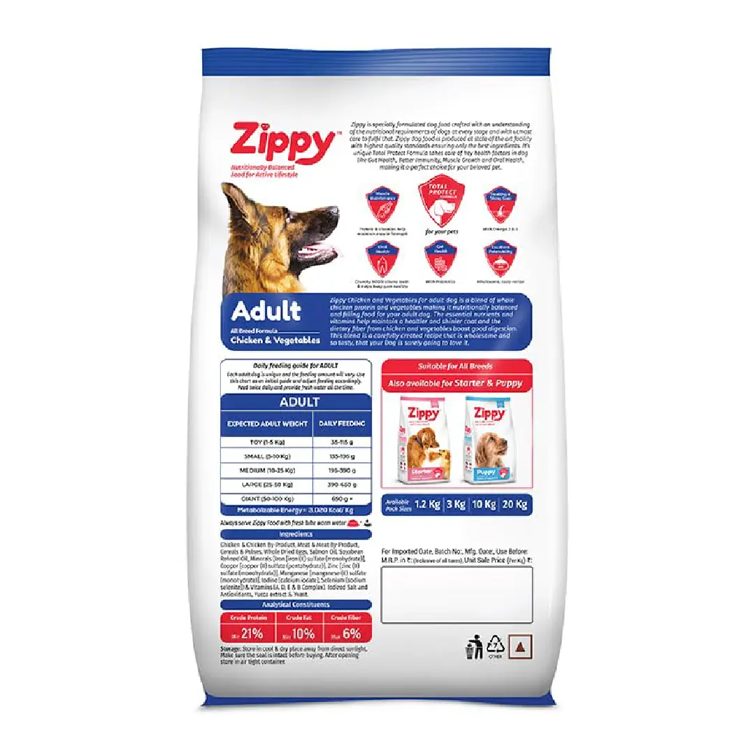 ZIPPY ADULT CHICKEN & VEG DRY FOOD by ROSSARI is a well-balanced dry food designed for adult dogs. This non-vegetarian formula supports an active lifestyle, helping maintain muscle strength, promote a healthy, shiny coat, and ensure overall well-being, reflecting Animeal’s dedication to high-quality pet care.